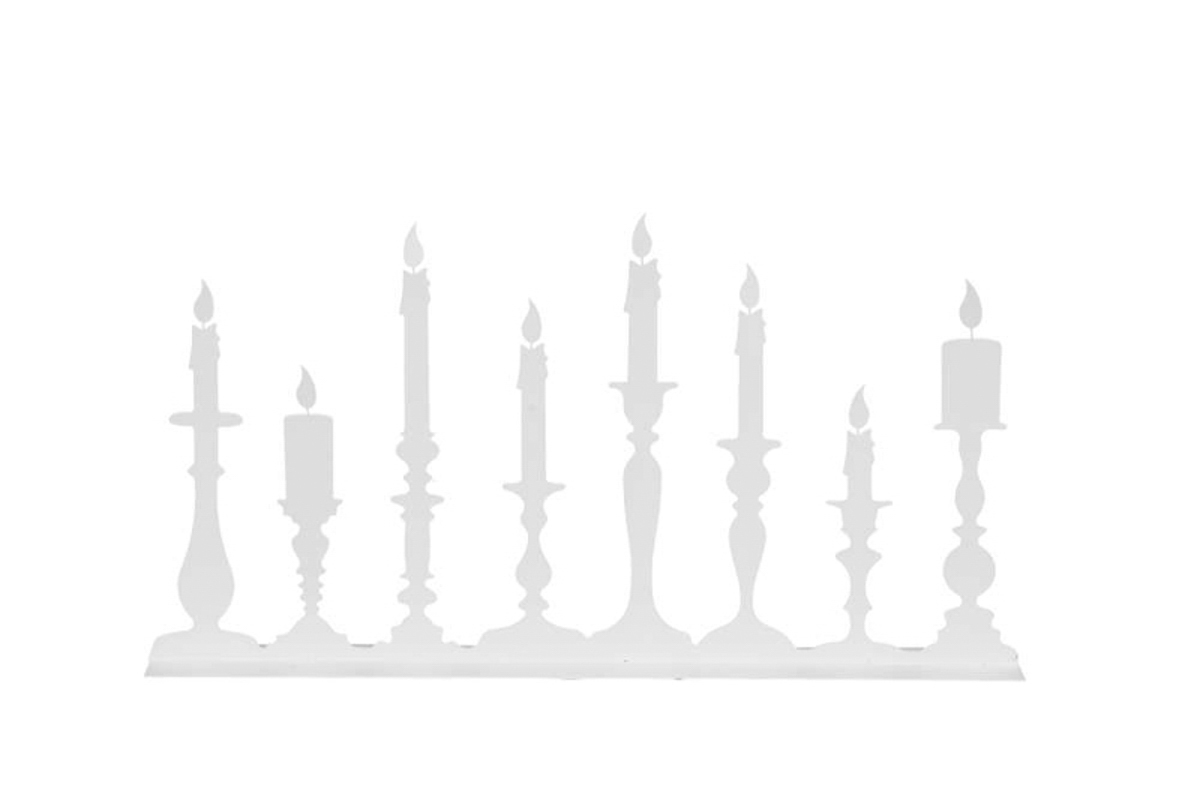 Castiçal com formato de velas, em metal de cor branca. Dimensões 47x7x25cm.