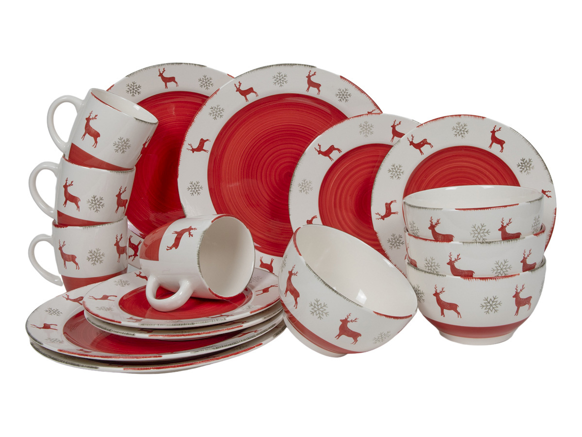 Conjunto Rendeer em cerâmica com 16 peças de cor vemelha e branca com motivos de Natal. Inclui 4 pratos rasos com 27cm 4 pratos de sobremesa com 14cm 4 taças com 14cm e 4 canecas com 350ml. Apto para microondas, forno e máquina de lavar.