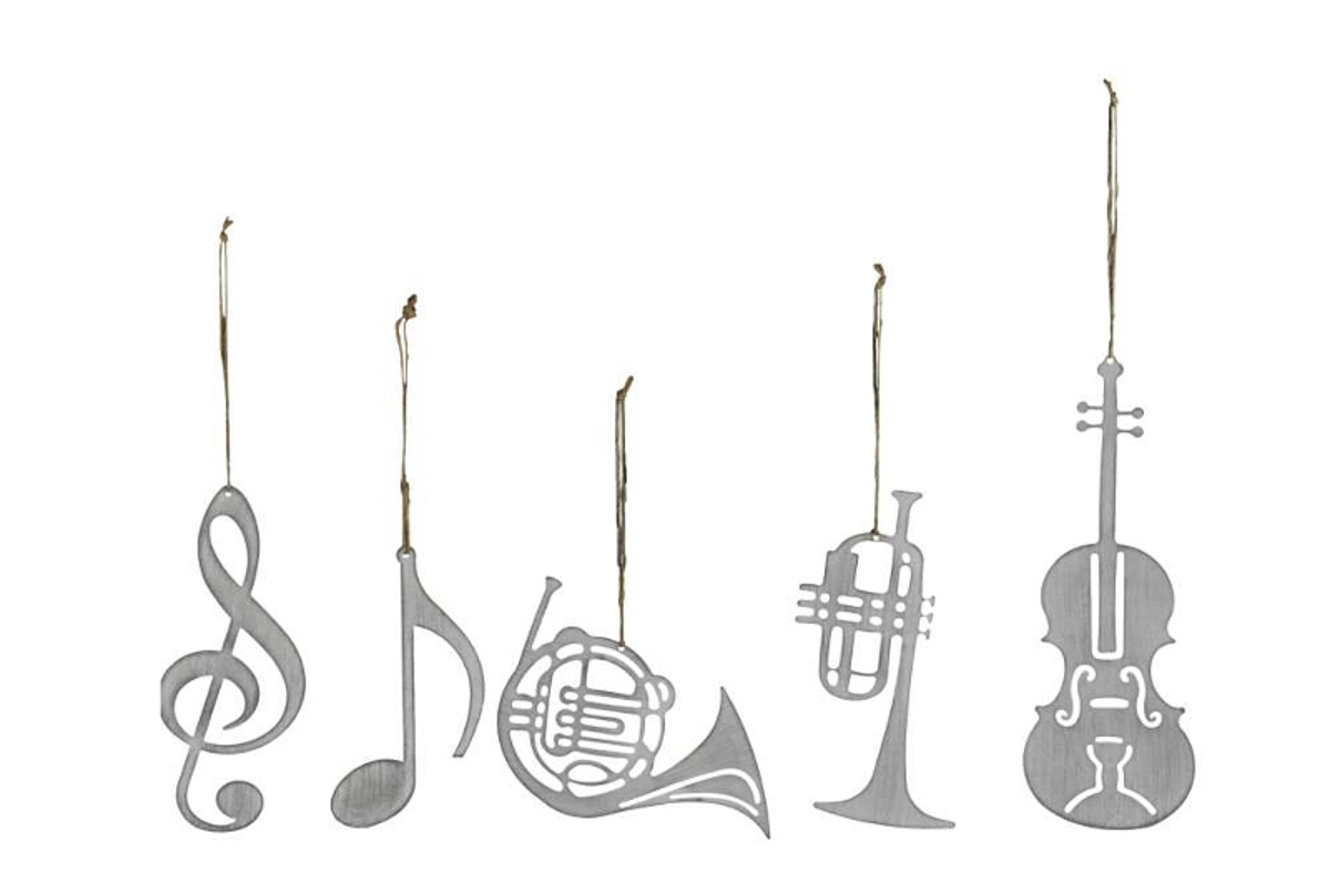 Conjunto de 5 instrumentos musicais em metal de cor cinza. Dimensões variáveis 11x18cm| 9x22cm| 18x15cm| 8,5x21cm| 10,5×30,5cm.